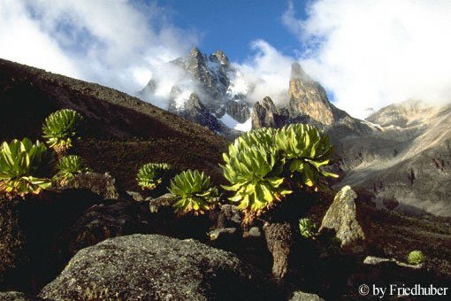Vom Hohen Atlas mit seinen Schitouren am Rande der Sahara über harmonischen Dünen und bizarren Mondlandschaften in der libyschen Wüste, bis zu den Extremklettergebieten Südafrikas spannt sich der Bogen. Kaum bekannt sind die Simien-Berge im Norden Äthiopiens, eingebettet in eine archaische Kulturlandschaft. Steil und abweisend ist die Gipfelregion des Mount Kenya. Mit seinen fast 6000 Metern ist der Kilimandscharo das Traumziel für tausende Bergsteiger aus aller Welt. Ein mystischer Berg, auf dem man in wenigen Tagen durch alle Klimazonen dieser Erde steigt. Auf dem Weg in die Serengeti sieht man in der Ferne den Ol Doinyo Lengai, den heiligen Berg der Masai, einen noch aktiven Vulkan, aus dem kalte Sodalava fließt. Üppige Natur erlebt man am Ruwenzori und in den Virunga-Bergen. Eine exotische Vegetation mit riesenwüchsigen Blumen und die Begegnung mit den letzen Berggorillas. Der Bergfotograf Hermann Erber trotzt in Südafrika den Gesetzen der Schwerkraft und entführt die Leser in die senkrechten bis überhängenden Klettergebiete im südlichen Afrika.