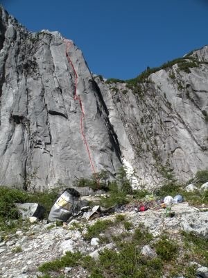 Von unserem unbequemen Biwakplatz aus erspähen wir früh morgens eine Linie. Die Linie befindet sich auf der anderen Talseite und ist durch ein Risssystem klar vorgegeben. An nur einer Stelle sieht der Fels „unkletterbar“ aus. Erschöpft steigen wir ab zum Campingplatz.