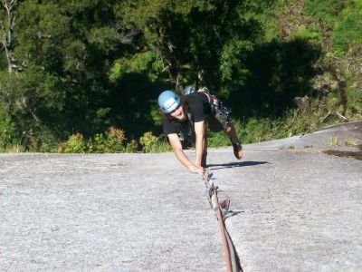 Bei der Gelegenheit bohre ich die letzten noch fehlenden Bohrhaken, damit die Route auch ohne Todesmut frei zu Klettern ist. Während der ganzen Aktion am Fels regnet es in Strömen und ich bin durch und durch nass.