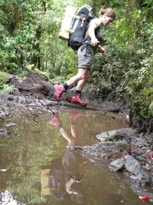 Am siebten Tag haben wir die Nase voll. Gerda und ich beschließen aufzusteigen. Der Aufstieg gestaltet sich teilweise sehr schwierig. Dreckiger Dschungel, schmierige steile Reibungsplatten und der angeschwollene Gebirgsbach kosten uns einiges an Zeit und Kraft.
