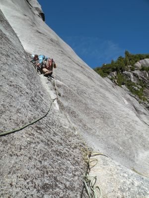 Um uns an den Fels in Cochamo zu gewöhnen klettern wir eine nicht ganz 900 Meter lange Route am Cerro La Junta. Da sich die Kletterei schwierig gestaltet und die letzte Seillänge schlichtweg nicht existiert, müssen wir im Abstieg ungeplant biwakieren.