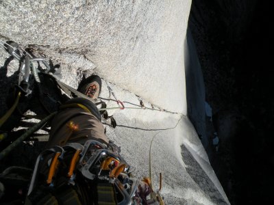 Die Kletterei ist leicht, nicht ganz senkrecht und der Riss ist verschlossen. Das heißt: Es ist keine Absicherung möglich. Aufgrund der schlechten Absicherung klettere ich technisch, meist an Beak´s. Ein paar Hook´s sind auch nötig. Haken und Friends können im unteren Teil nur wenig verwendet werden. Die Verwendung von Klemmkeilen in der ganzen Tour beschränkt sich auf eine Hand voll.