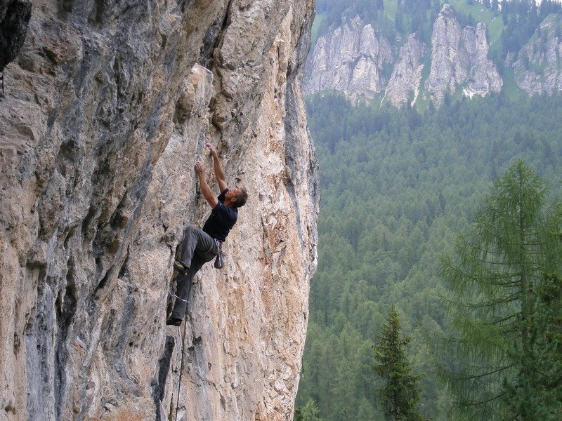 Charakter: Klettern auf einer senkrechten Wand mit guten Griffmöglichkeiten. Die Felsbeschaffenheit ist Dolomit-Riffgestein.