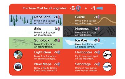 Während man klettert, platziert man Routenmarker und kann diese auch sichern, damit kein anderer Spieler sie sabotieren kann. Will man neue Ausrüstung erwerben, kostet das einmalig fünf Versorgungsmarker. Anschließend kann die Ausrüstung weiter benutzt werden. Das kostet dann zwar immer noch Versorgungsmarker, aber nicht mehr so viele. Zum Beispiel kann man sich einen Kletterharnisch für fünf Marker kaufen, direkt einmal anwenden und anschließend immer wieder für drei Marker benutzen, um auf Felsen rasch voran zu kommen. Außerdem gibt es wiederverwendbare Eispickel, Seile, Skier und auch Sonnenschutz zu kaufen. Will man aber mit dem Helikopter fliegen, muss man jeden Flug voll bezahlen. Am Berg sind auch Hobbykletterer unterwegs, die von keinem der Spieler kontrolliert werden. Deren Bewegungen werden zufällig bestimmt und kommen den Profis so immer mal in die Quere. Zusätzlich kann es auch passieren, dass die Hobbykletterer einmal gesetzte Routenmarker wieder kaputt machen. Das Spiel endet wenn alle Ereigniskarten gezogen wurden. Wer dann die meisten Kletterpunkte hat, ist der Sieger von Mountaineers.