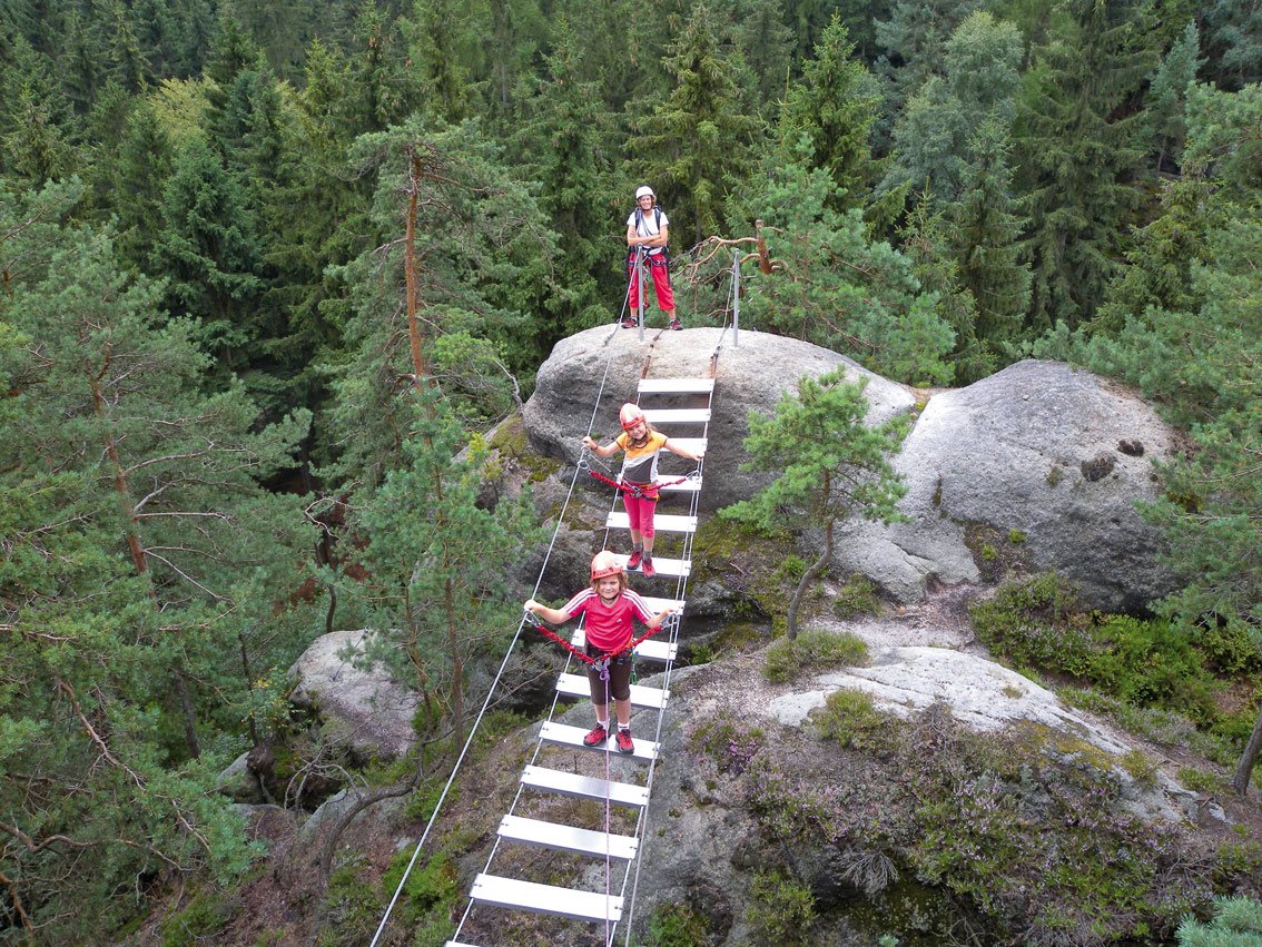 Als Kontrast zu den mächtigen Alpenwänden finden sich im Elbsandsteingebirge unzählige Felsnadeln und Türme, die aus dem dichten Wald über die Baumwipfel ragen und in einer malerischen Landschaft ein gutes Betätigungsfeld für Klettersteiggeher bieten. Die Klettersteige heißen im Elbsandsteingebirge Stiegen, haben oft abenteuerlichen Charakter und mit dem klassischen Klettersteig wenig zu tun (Beispiel Starke Stiege).
