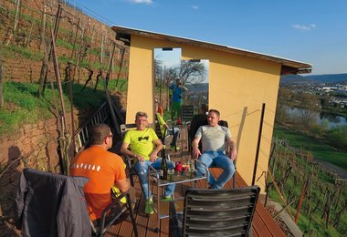 So wird der ausgezeichnete Spätburgunder von den Südwesthängen des Höhberges bezeichnet, mit dem die Winzer Weltruhm erlangten. Auch der kleine Klettersteig, der sich zwischen den Weinbergen hindurchschlängelt, wurde vom Weinbauverein errichtet. Wichtig bei diesem Steig ist, dass man auf der Route bleibt, denn bereits am Einstieg zweigt der Fränkische Rotwein Wanderweg ab. Wer den Versuchungen widersteht, erlebt ein paar kurze, aber auch recht knackige Klettersteigpassagen in Absprunghöhe. Prost!
