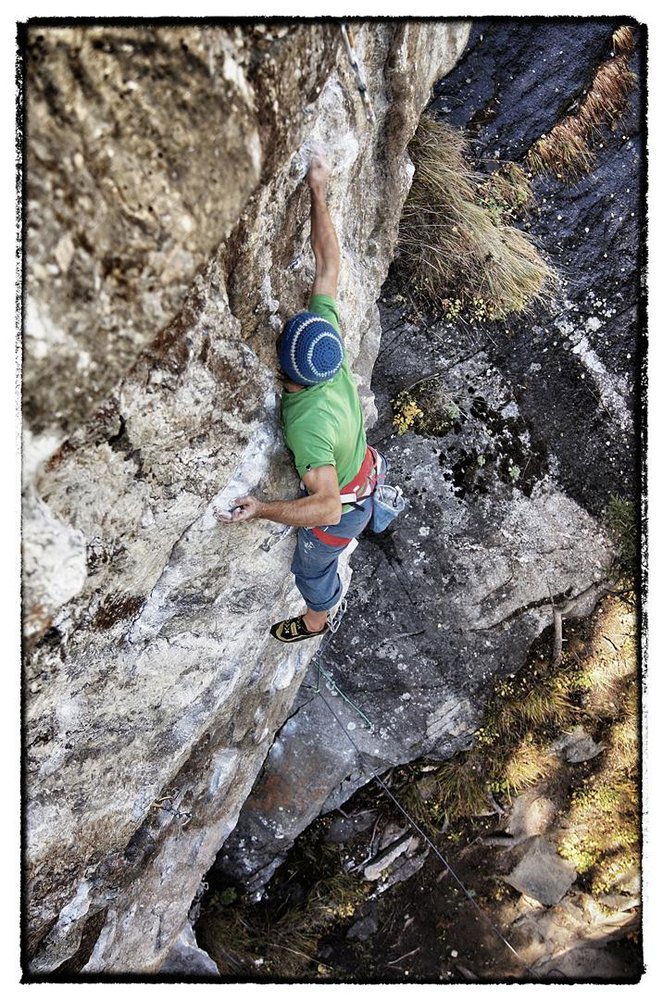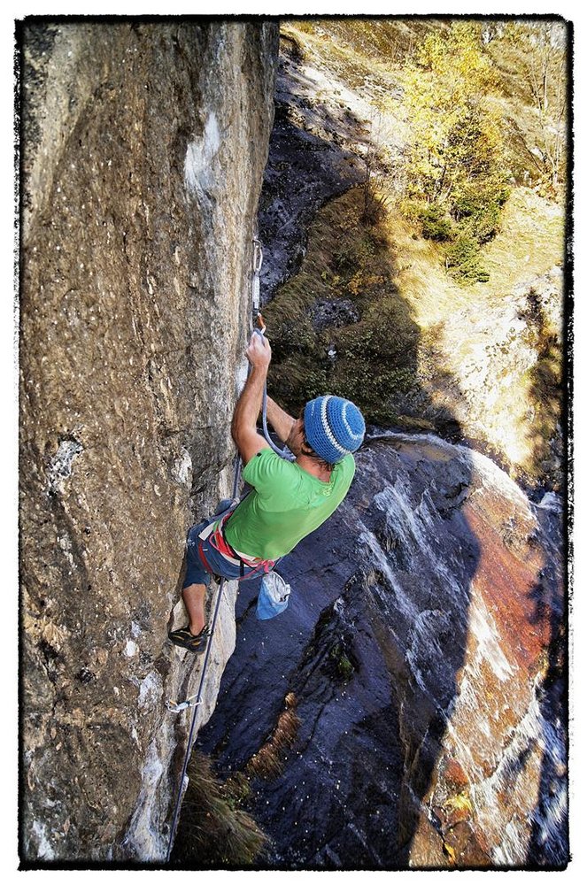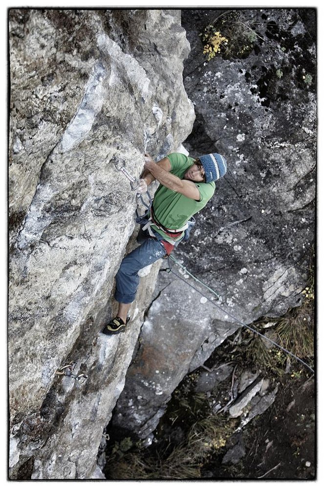 Ein paar Meter weiter rechts ums Eck gibt es eine neue alte Route. Die Marquis de Sade (8b) war ursprünglich mit 8a bewertet, doch die Tour wurde verlängert und einige mit Sika befestigten Schuppen verschwanden auf mysteriöse Weise. Ich wusste nicht ob ich schon reif war für den neuen Grat, doch wie so oft war die größte Hürde im Kopf und als ich mich doch nach einigem zögern entschloss die Route zu probieren machte ich schnell Fortschritte.