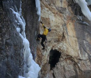 Ich schlage Ronny vor links in der Wand in Rock and Ice einzusteigen. Stefan Fluch hat mir die Route anhand eines Fotos gut beschrieben, ein paar Bolts stecken auch, also sollte es zu finden sein. Das steile Gelände schützt uns auch optimal vor Eisschlag. Gesagt getan, wir queren zur Route hinaus und ich beginne mit dem Klettern.