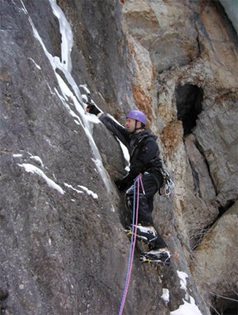 Egal, der Bolt war jedenfalls nicht vorhanden und Robert tat das was man(n) machen muss, er vertraute darauf, dass sich ein zumindest für kurze Zeit belastbarer Hook unter dem Schnee befindet und zog hoch zum Bolt. Das sind diese Momente, die ich besonders liebe, denn ich bin überzeugt, dass ich in dieser Situation um einiges nervöser bin als Robert. Noch dazu wäre in der Seitschuppe gut Platz für einen Friend gewesen, den wir natürlich nicht mit hatten. Jedenfalls wäre ein Sturz ganz schön hart ausgefallen, denn beim kontrollierten Fallen hätte er sehr weit nach hinten springen müssen und beim unkontrollierten Abgehen wäre er ziemlich hart auf dem Band aufgeschlagen. Dies war objektiv gesehen die Situation. Robert meinte „zum Glück ist etwas Schnee auf dem Band!??“ Danach sah alles eigentlich ganz locker aus in dieser M8- SL. Robert zog ziemlich schnell die SL hoch, erwähnte nur, dass diese SL auch mit Kletterpatschen ganz schön wäre, denn der Fels bietet sehr gute Qualität. Einmal überlegte er kurz bevor er weiterging, da es sehr kleinstrukturiert wurde, aber auch das stellte kein Problem dar und somit machte Robert ca. 3m links unterhalb von der Stelle, wo die Eissäule am Felsen anwuchs Stand.