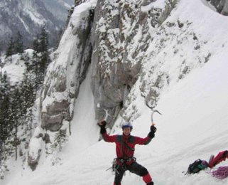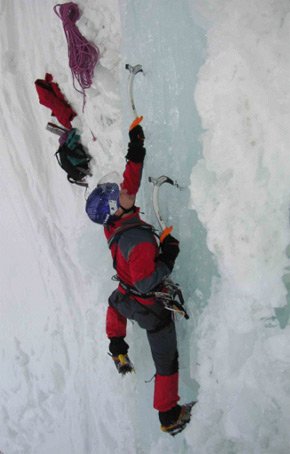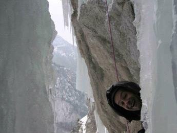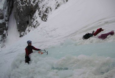 Als wir uns dann auch wirklich einig darüber waren, dass Eis eher eine Materie ist, der man nicht so vertrauen kann, packte Robert das Zeug und ging die nächste Seillänge dann auch noch. Das war allerdings wieder so ein Moment, wo ich eher dazu tendiert hätte, abzuseilen, Geburtstag zu feiern und vor allem das Eisklettern völlig aufzugeben und die Geräte mal wieder an den Nagel zu hängen (meine bis dahin 3-monatige Eiskletterkarriere wäre ja auch gar nicht so schlecht gewesen), anstatt die nächste SL auch noch zu gehen. Naja, nachdem Robert die SL ja auch schon geklettert ist und einer ja die Schrauben auch wieder einsammeln musste, bin ich sie natürlich nachgestiegen. Doch als ich zum ersten Sicherungspunkt kam, merkte ich, dass auch Robert etwas Verunsicherung zeigte (zum Glück, denn nun weiß ich, dass auch er menschliche Züge hat), denn er knallte die zwei längsten Eisschrauben die er hatte, in einer Felsnische so ins Eis, dass bei einem schweren Sturz zuerst der Felsen zusammengebrochen wäre, bevor diese ausgerissen wären.