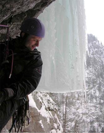 Dann ging Robert wieder weiter, gleich rechts im Überhang war noch ein Bolt, den er clippte, bevor er das Eisgerät mit der rechten Hand auf die Säule setzte und anschließend hinaus spreizte. Dann setzte er das zweite Gerät auch nach ins Eis. Und da passierte es: wahrscheinlich hat er mit dem Pickel direkt hinter der Eisoberfläche der Säule einen Zapfen im hohlen Eis erwischt, der beim Hinunterfallen in der hohlen Säule ständig hin und her fiel und nach ein paar Sekunden 30m weiter unten aufschlug.