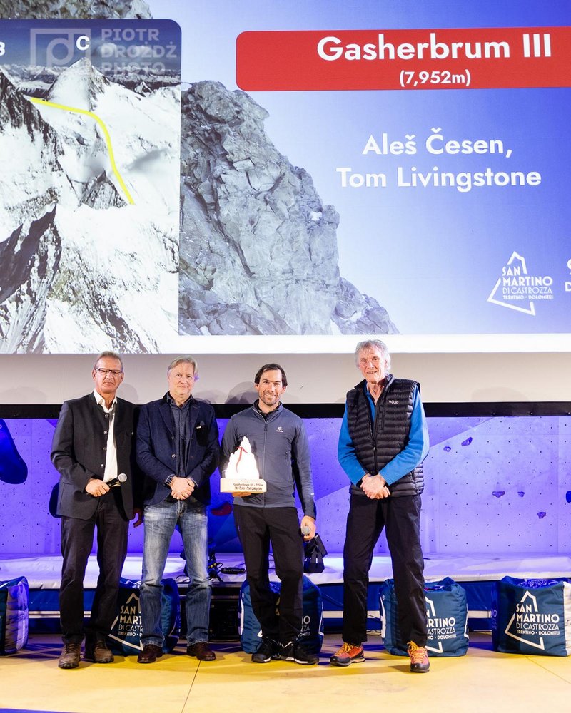 Aleš Česen (der Sohn von Tomaž Česen) und Tom Livingston hatten vor allem oben, zwischen 7.000 und fast 8.000 Metern, zu kämpfen. Die Schwierigkeiten stiegen deutlich an, das Wetter war nicht optimal und zu guter Letzt mussten die beiden Bergsteiger kurz unterhalb des Gipfels noch im Sitzen biwakieren. Es war als Zuschauer in San Martino schon beeindruckend, welche Leistungen Aleš und Tim kurz unterhalb der 8.000er-Marke vollbrachten! Mehr dazu findet ihr hier: Tom Livingstone (UK) und Aleš Česen (SVN) werden mit Piolets D’Or ausgezeichnet
