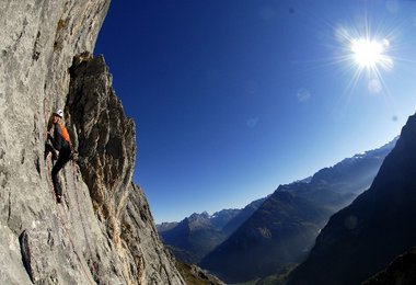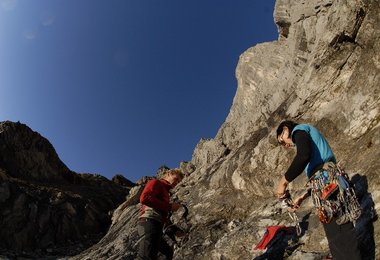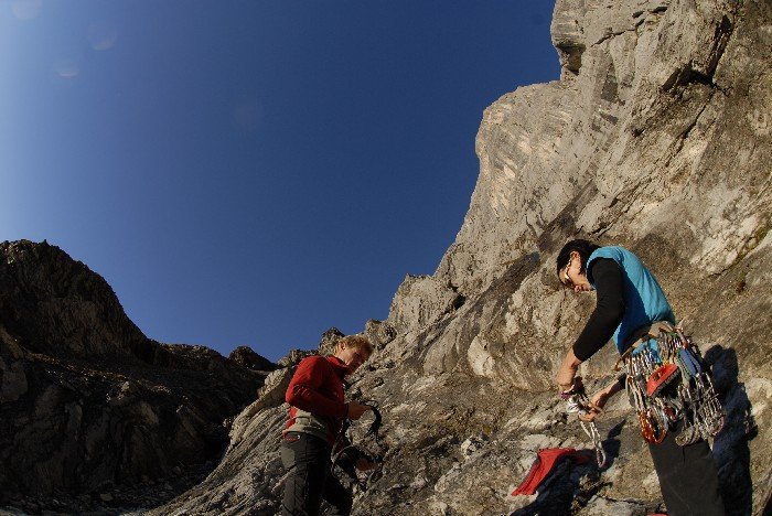 Für den „Seilzweiten“ ist es eher eine langweilige Angelegenheit. Ist doch seine einigste Aufgabe, mich mit Material zu „beliefern“ und möglichst eng zu sichern. Aber es ist Land in Sicht….und runter müssen wir auch bald, denn es beginnt zu dämmern.
