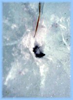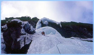 Unsere Taktik war folgende: Josef steigt alles vor, baut wenn die 60m langen Seile zu Ende sind einen guten Stand, damit ich im Nachstieg auch mal einen Sturz riskieren könnte um so schnell wie möglich nachzukommen. So nahmen wir die ersten 120m in Angriff. Das Eis war perfekt und so wurden die ersten beiden Seillängen zu einem richtigen Genuß. Die dritte Seillänge machte zuerst den Eindruck als würde sie die leichteste werden. Es sollte sich jedoch zum Gegenteil wenden. Josef nahm die ersten 30 Meter in gewohntem Tempo auf und verschwand hinter einer Felskante, die mit dünnem Eis überzogen war. Sobald er meinen Blicken entschwunden war stockte sein Tempo plötzlich und das Seil lief nur mehr zentimeterweise durch meinen Sicherungskarabiner. Ich weiß nicht wie lange es gedauert hat bis endlich die 60 Meter Seil zu Ende waren. Wir hatten weder Blick noch Rufkondakt und das Zeichen, daß Josef einen Standplatz gefunden hatte ( das sich immer durch einen kräftigen Zug am Seil bemerkbar machte, so daß ich mich immer gleich um 20 Kilo leichter fühlte) blieb aus. Es blieb mir nichts anderes übrig, als daß ich meine Selbstsicherung löste und solange weiter klettere, bis Josef einen vernünftigen Standplatz gefunden hatte. So kletterten wir im Schneckentempo gleichzeitig etwa 20 Meter und das, wie ich erst später bemerkte nur an zwei Eisschrauben gesichert. Wobei Josef etwa 25 Meter über der letzten Sicherung einen meisterhaften Eiertanz auf unzähligen ca. 20cm langen und 5 cm dicken Eispilzen vollführte. Obwohl ich das vorerst nicht wußte, war ich sehr erleichtert als ich plötzlich den starken Zug am Seil spürte. Drei Meter bevor ich zu Josef in einen Adlerhorst aus Eis stieg, sah ich noch eine abgebrochene Hohlhaue, die von einem Eisgerät Josefs stammte, im Eis stecken. Wir befanden uns nun an jener Stelle, wo die meisten Begehungsversuche scheiterten.