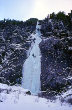Im ersten Augenblick dachte ich das gleiche, doch Josef ist einfach durch nichts aus der Ruhe zu bringen. Er sagte nur in seinem Wildschönauer Dialekt: " Mei i schaugs ma hoit amoi uh. paß auf! es weascht worscheinlich hibsch scheppan und rumpen, a bor zapfn wean scho oicha kugln." Und schon kletterte er mit einer Seelenruhe in das Gewirr von kreuz und quer gewachsenen Eiszapfen. Nicht selten flogen riesige Eisbrocken nur zwei Meter an mir vorbei, ich stand jedoch seitlich durch einen Felsüberhang geschützt. Nach einigen Metern verschwand Josef wieder hinter einer Kante Ich hörte nur das Donnern des Eises, manchmal wurde es ruhig und ich hörte ihn rufen: "Do is vielleicht a bärigs eis! Ned amoi so schwar wias ausgschaug hot! Oba mit 6 muaß mas scho bewertn." Dann kam er wieder in leichteres, aber doch fast senkrechtes Gelände mit kompaktem Eis und in gewohnter Schnelligkeit war das 60 Meter lange Seil auch schon wieder zu Ende und der nervenberuhigende starke Ruck am Seil war auch wieder zu spüren. Ich folgte so schnell ich konnte, denn mittlerweile waren schon einige Stunden vergangen und schließlich mußten wir ja auch noch den ganzen Wasserfall hinunter. Am Anfang brauchte ich noch nicht mit meinen Eisgeräten ins Eis zuschlagen, denn ich konnte die Löcher die Josef hinterließ gut sehen und ich brauchte die Spitze der Eisbeile nur darin einhängen damit ich höher steigen konnte.
