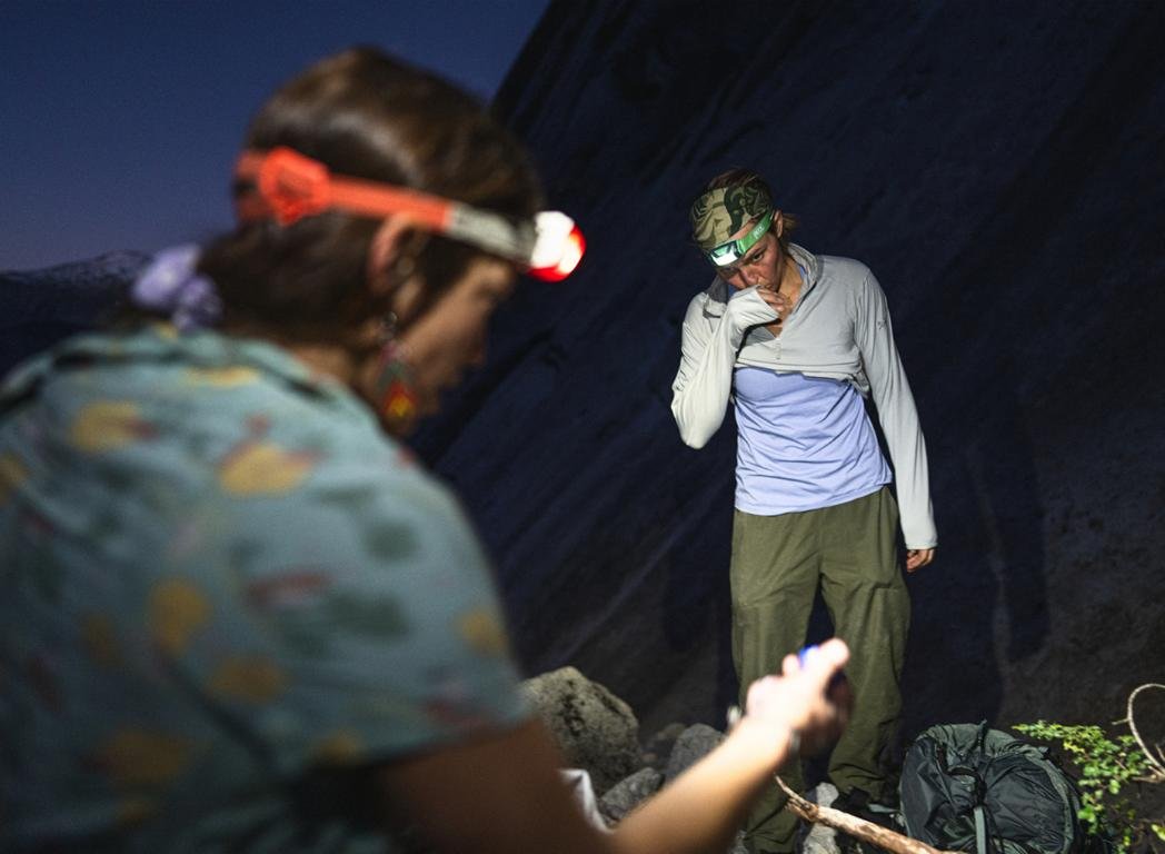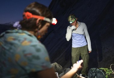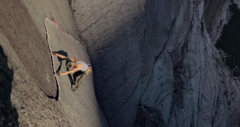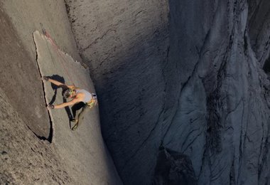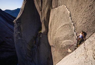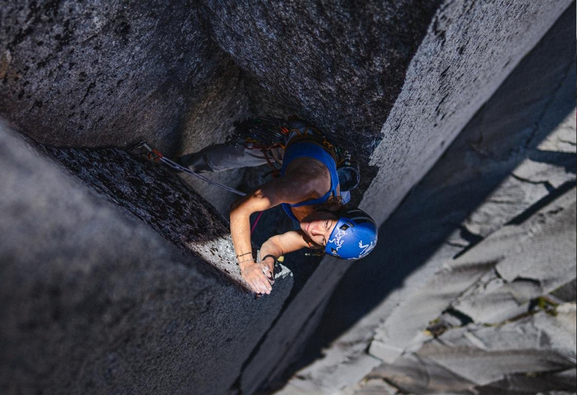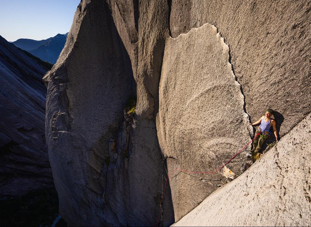 Am anderen Seilende klettert Profisportlerin Em Pellerin, eine Meisterin des Trad-Kletterns, die als erste Kanadierin eine 5.14 Trad-Route gemeistert hat. Ehemals mit der Gitarre in einer Band, heute ganz oben in der Kletterelite Amerikas.