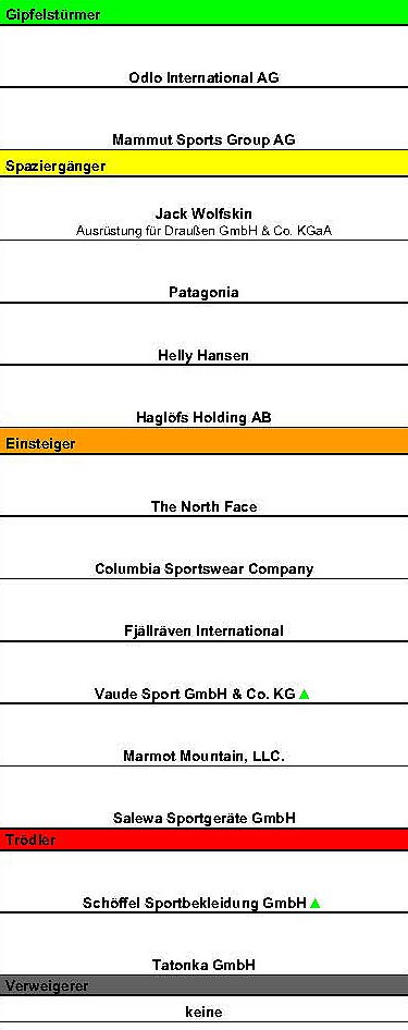 Auch das deutsche Unternehmen Vaude befindet sich noch in dieser Kategorie. Das könnte sich aber bald ändern. Vaude und das noch schlechter eingestufte Unternehmen Schöffel haben in Aussicht gestellt, der Multi-Stakeholder-Initiative Fair Wear Foundation beizutreten. Damit würden sich die Unternehmen einem der weitest reichenden Verhaltenskodizes verpflichten.