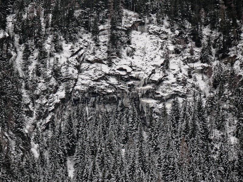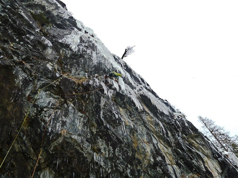 Rätselburg (WI7+, 80m): Ernste Route in einer steilen Nordwand. Dünnes Eis und überhängender Fels zu Beginn. Erbegehung gemeinsam mit Mathias Nössig. Die Route ist selber abzusichern, keine Bolts.