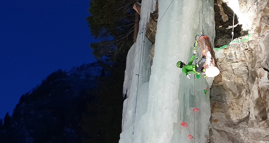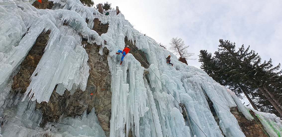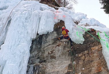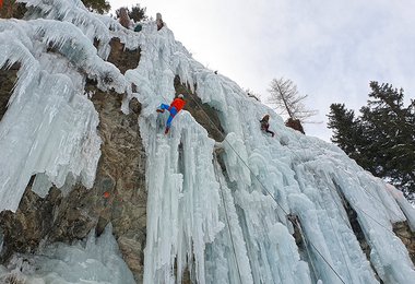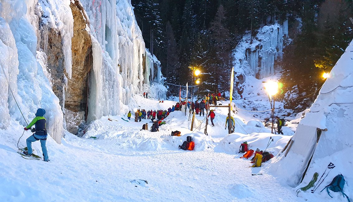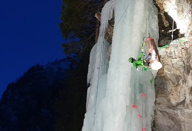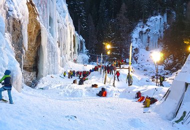 In den Eisparkrouten waren Topropes eingehängt, man konnte zwischen leichtem bis sehr schwerem Wassereis und steilem bis überhängenden Fels (Mixedrouten) wählen. Es machte richtig Spaß, sich an den perfekt vorbereiteten Routen zu versuchen, wobei man bei den bis zu 25 Meter hohen, senkrechten bis leicht überhängenden Eisschilden, trotz der tiefen Temperaturen, schon ganz schön ins Schwitzen kam. Auch die Mixedrouten waren mit weiß markierten Hooks perfekt für die Besucher des Eiskletterfestivals vorbereitet worden.