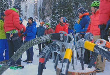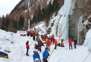 Der Eispark in Osttirol - und das muss man wirklich ganz am Anfang schreiben - präsentierte sich in perfektem Zustand, als am Samstag, dem 14. Jänner das 6. Eiskletterfestival Osttirol und erstmals im Eispark die österreichischen Meisterschaften im Eisklettern stattfanden. Schon von weitem konnte man das Eis beim morgendlichen Zustieg in der Sonne funkeln sehen und auch am restlichen Tag war keine Wolke am Himmel. Am Vormittag war Eiskletterfestival angesagt, man konnte von zahlreichen Herstellern die neuesten Steigeisen und Eisgeräte kostenlos nach Herzenslust testen.