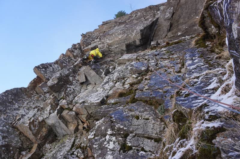 Nach drei Tagen Erstbegehungsarbeit sind die zwei nun eigentlich ganz stolz auf die neue entstandene Mixed-Linie - es ist eine richtig geile Mixedkletterei geworden. Mit Ausnahme der dritten Seillänge (die mitten durch die fein strukturierte Plattenwand führt) sind die anderen Seillängen meist selbst abzusichern, mit schönen parallelen Gneisrissen und oft Bomberhooks. Wenn man schlussendlich durch das letzte Dach der vierten Länge hinauf rampft, kann man es wirklich kaum glauben, dass Winterklettern so viel Spaß machen kann!