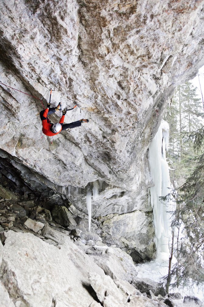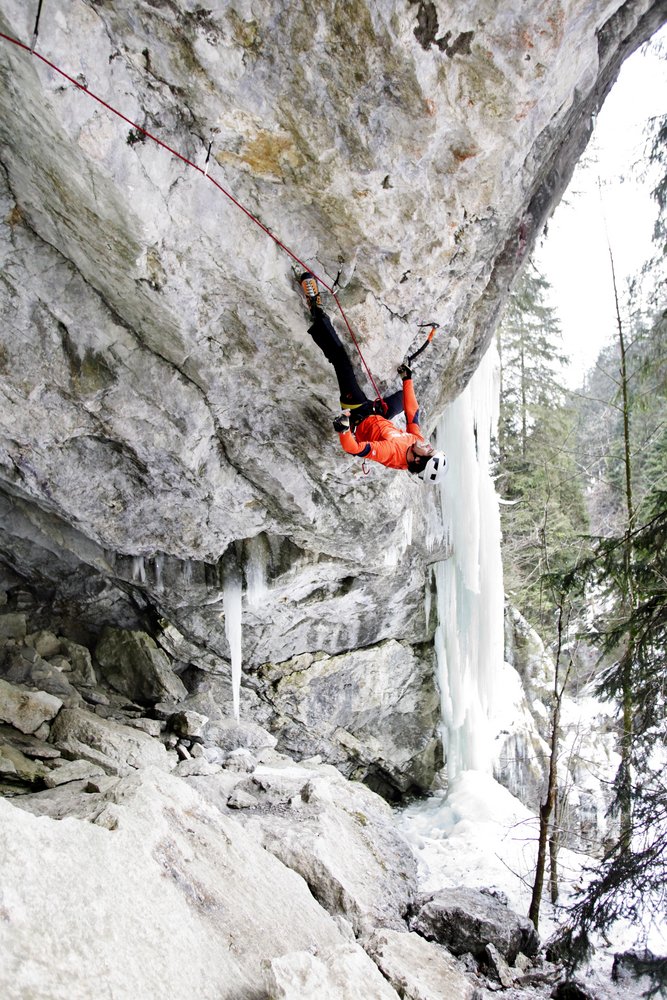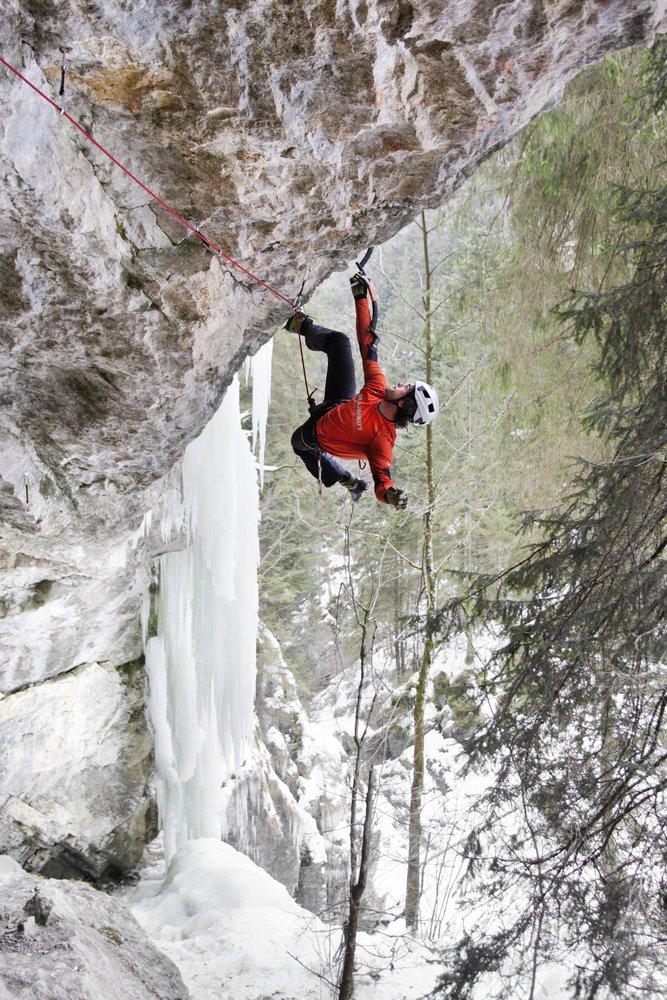 Den Anfang machte nach einigen längeren Eisfällen im sechsten Eisgrat und leichteren Mixedrouten im Bereich M8 und M9 zwischen Bregenz und Garmisch die Route „Papi´s kleiner Liebling“ (etwa M11) in der Starzlachklamm. Nach zwei Tagen Ausbouldern und etwas zu zögerlichen Anläufen im doch etwas einschüchternden, acht Meter ausladenden Negativdach genügten dann am dritten Tag ein ernsthafter Versuch mit etwas mehr Mumm zum Durchstieg.