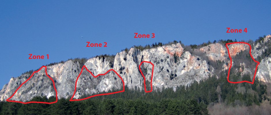 für Steinschlag und Felssturz ausgewiesen (auf dem nebenstehenden Foto rot gekennzeichnet). In diesen Zonen bestehen erhöhte Steinschlag- und Felssturzgefahr: