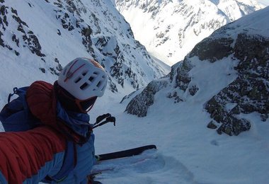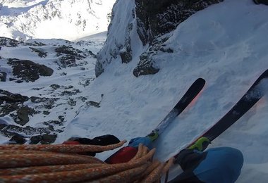 Eigentlich dachte ich mir ich könnte diesen Teil recht einfach abrutschen bei dem vielen Schnee, jedoch war die obere Ausstiegsrinne total ausgeblasen und etwas eisig. Deshalb legte ich meine 60m Radline um ein Köpfel und rutschte bzw stieg die obersten 25m mit den Skiern hinunter bis man einigermaßen stehen konnte. Viel "Skifahren war es die nächsten 50m nicht wirklich, mehr eine Kombination aus rutschen, umspringen und mit den Ski abklettern, aber eigentlich machte es mir auch ziemlich viel Spaß! Als die Rinne dann breiter wurde gingen sich ein paar kurze Schwünge im Pulverschnee aus bis ich zu meinem ersten richtigen Abseiler kam.