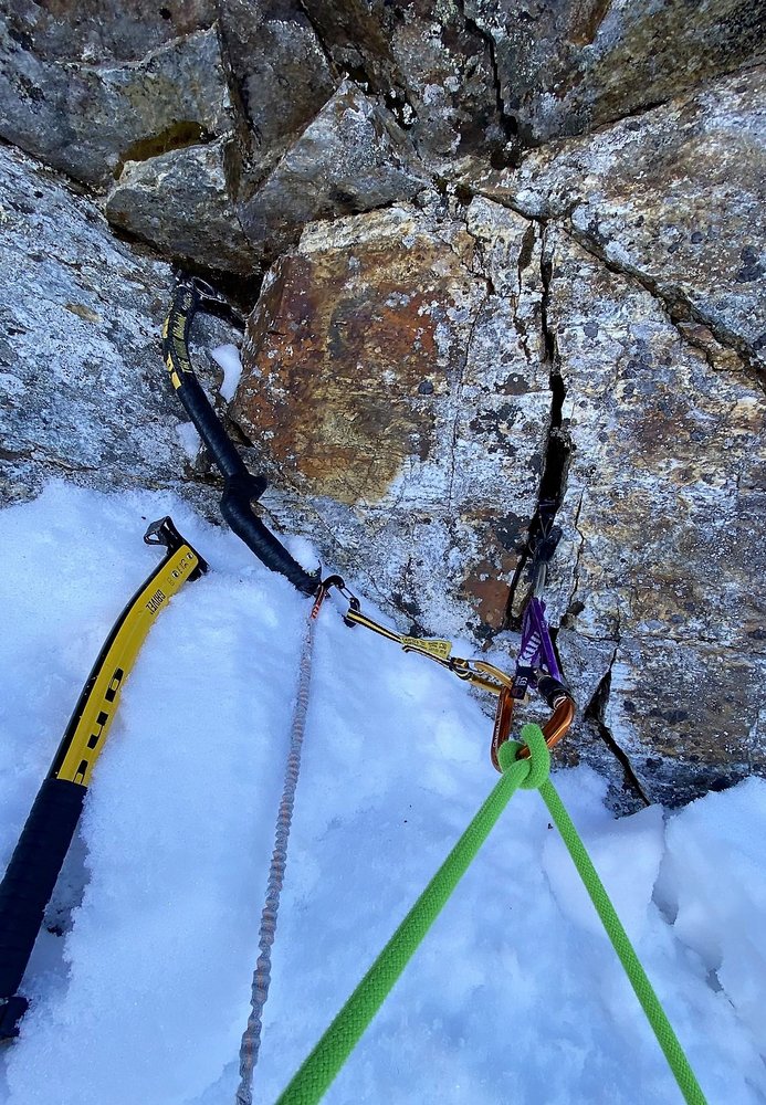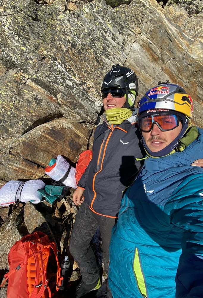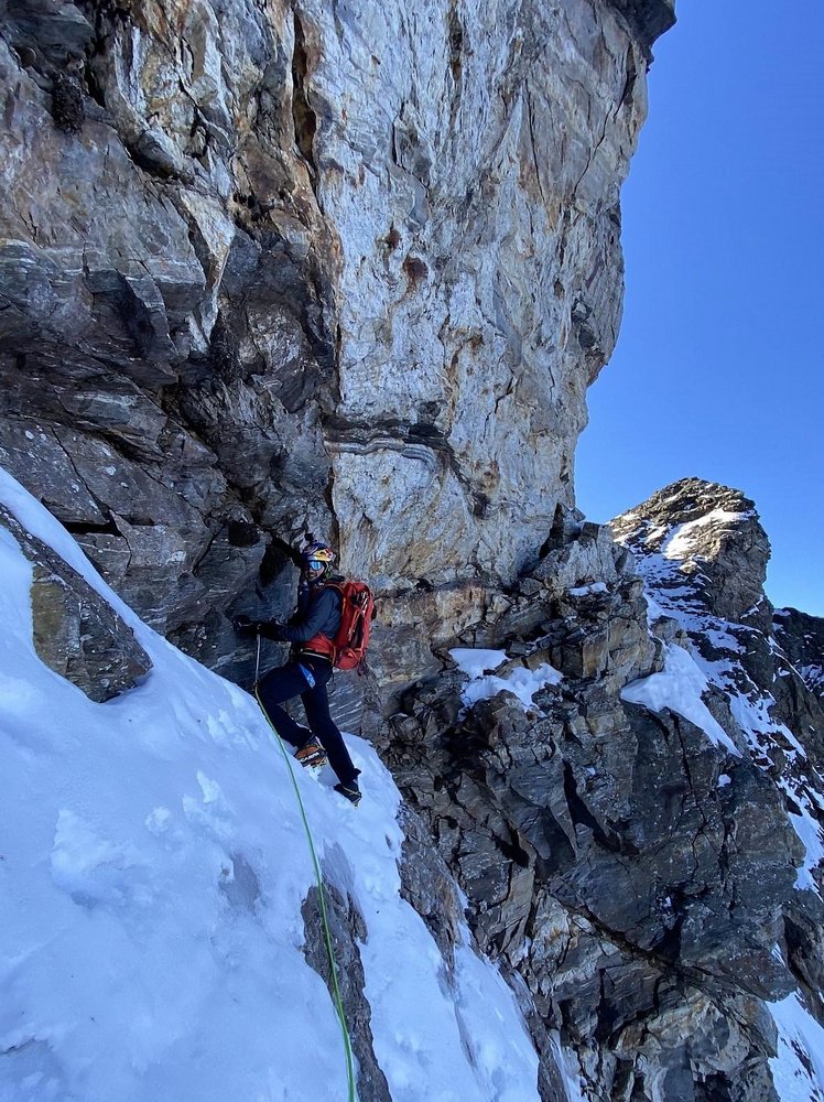 Am Sonntag den 29.11.2020 eröffneten die zwei Südtiroler Simon Gietl und Aaron Duragati eine neue Linie an der Nordwand des Rauchkofels in der Rieserferner Gruppe. Bereits im Laufe der vergangenen Wochen konnten sie dank des stabilen Hochdruckswetters die Nordwände des Antelaos, des Wasserkopfs und des Hochgalls besteigen. Das ideale Spätherbstwetter ließ jeweils auch Gleitschirmflüge von vorher genannten Gipfeln zu. Simon, der ausgesprochener Experte für die Wände des tauferer Ahrntales und der Rieserferner Berge ist, hatte zudem noch die Idee eine Erstbegehung der Nordwand des Rauchkofels zu probieren. Seinem Wissen nach war die Nordwand noch ohne jegliche Begehung. Am Sonntag, nachdem wir uns in Sand in Taufers getroffen hatten, sind wir u 6.00 Uhr morgens zur Wand aufgestiegen. Die Rucksäcke waren relativ leicht. Bis auf unsere Schirme, die jeweils kaum 2kg wiegen, sparten wir bei Eisschrauben, Felshaken und Karabiner. Am Wandfuss angekommen folgten wir einer logischen Rampe. Nach Ende der offensichtlichen Rampe wechselten sich steile Eis- mit Felspassagen ab. Nach einigen heiklen Stellen im kombinierten Wandbereich erreichten wir den Grad. Derselbe führte uns nach kurzer Kletterei zum Gipfelkreuz.