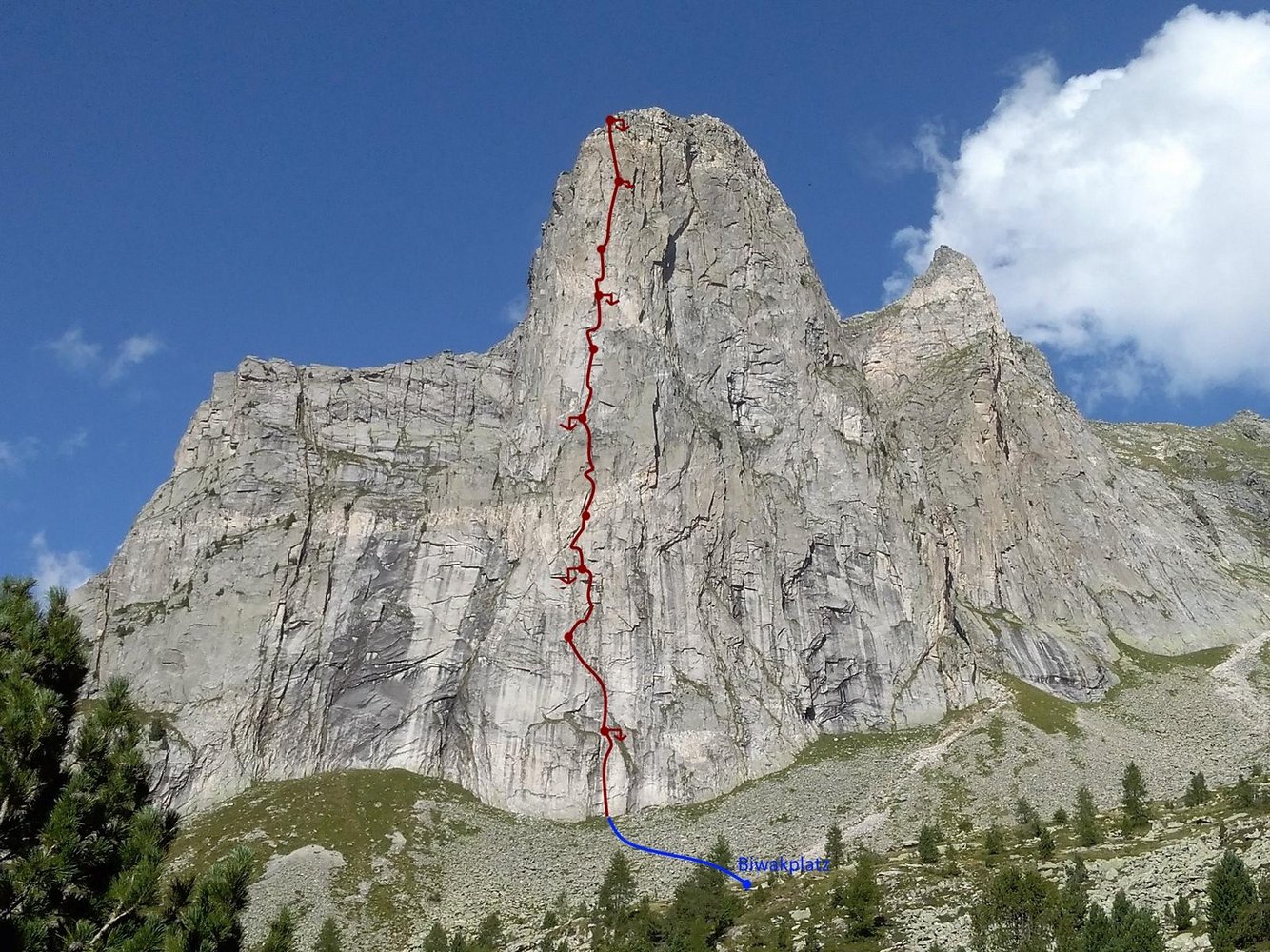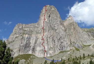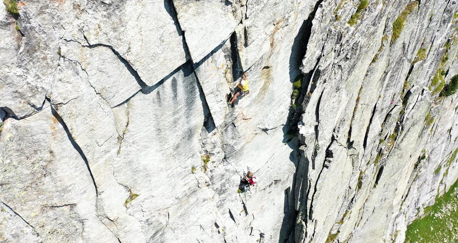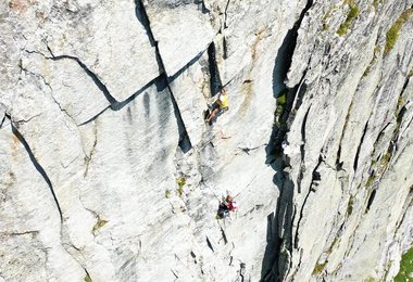 So schön und überwältigend wie die Wand aussieht, wenn man unter ihr steht, so schön und überwältigend entstand auch unsere Linie, welche wir "Zirbe Direkt" nannten und die mit 10 Seillängen und im Schwierigkeitsgrad bis 7b+ durch die mit rund 330 Klettermetern durch die Granitwand führt!