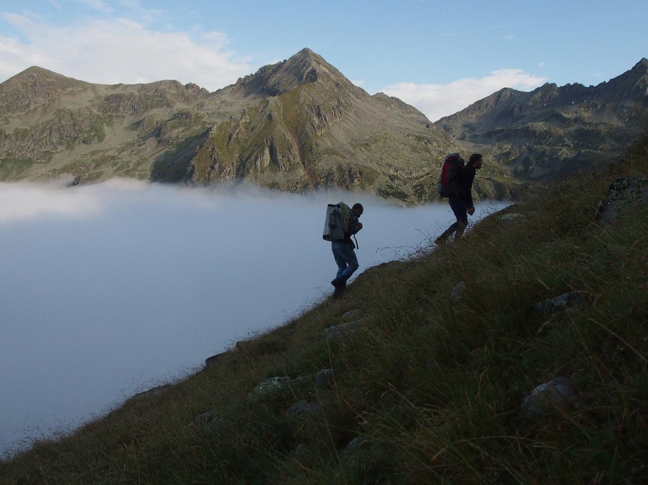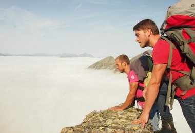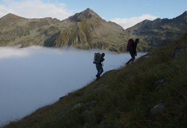 Mit vollbepackten Rucksäcken von bis zu 26kg starteten wir am Parkplatz ca. 300m vor der Zandlacher Hütte. Im Gepäck hatten wir Schlafsäcke, Essen, Schlaghaken, Kletterequipment, Seile, Portaledge, etc. und benötigten für den Anstieg rund 2 Stunden bevor wir den Wandfuß erreichten und unter einer großen Steinplatte unser Biwak einrichten konnten.
