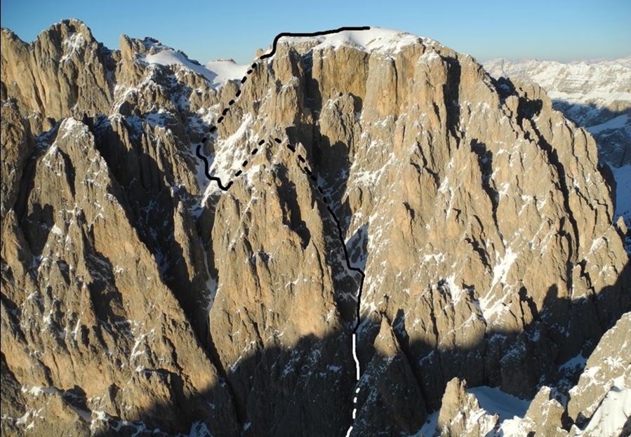 Der Spallone Sassolungo, wie der klangvolle italienische Name des Langkofelecks lautet, ist mit seinen 3081 m um etwa 100 m niedriger als der Hauptgipfel des eindrucksvollen Langkofelmassivs, zählt aber trotzdem zu den wichtigsten und schönsten Gipfeln dieses Gebirgszuges. Vor genau 15 Jahren gelang es dem italienischen Bergführer Hermann Comploj zusammen mit seinem Gast Fredmund Malik als erste die Südseite des Langkofelecks durch den SO Gully hinunter Richtung Col Rodella und Colac zu befahren. Seit diesem Zeitpunkt fragte sich Hermann Comploy immer wieder, ob es auch möglich ist, die wilde Südwestwand zu befahren, die ein wahres Labyrinth aus steilen Türmen und tiefen Rinnen ist.
