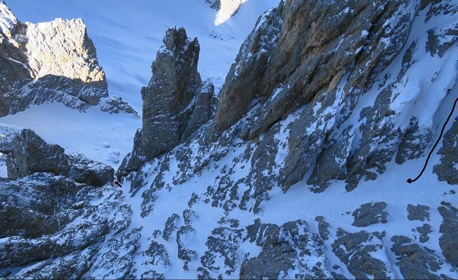 Ich kam in Berührung mit allen möglichen Arten von Schnee, vom Powder am Gipfel und im ersten westlich ausgerichteten Gully bis zum harten Firn. Ich stieg dann einen nach Nordwesten hin ausgerichteten Gully nach oben und auch dieser war voll mit Pulverschnee - bis zu meinem Bauch sank ich ein. Ich erreichte den Sattel zwischen Campanile dl Dragon und der Schulter von wo es weiter hinunter in einen extrem engen ostwärts ausgerichteten Gully ging, wo der Schnee wieder fest war. Nach ca. 100 m traf ich auf die nach Süden hin ausgerichtete Hauptrinne und je weiter hinunter ich kam, desto fester wurde der Schnee. Ich zog meine Skier zwei Mal aus, um die Steigeisen anzulegen, welche ich benötigte, um einige eisige Stellen passieren zu können. Am Ende führten mich zwei Abseilpassagen zum Fuß der Wand, wo der Normalweg auf den Langkofel beginnt.