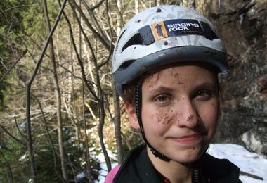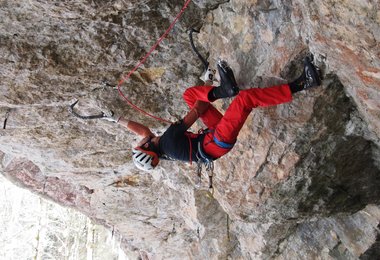 Beim ersten "scharfen" Versuch war es auch schon fast so weit, die letzte Zwischensicherung war schon eingehängt, 40 cm vor dem Abseilhaken fanden die Eisgeräte an einem Graspolster an der Dachkante halt. Lucie dachte schon die Route geschafft zu haben, doch plötzlich löste sich das ganze Grasstück vom Fels und landete direkt in ihrem Gesicht. Die Schwerkraft tat den Rest, Lucie baumelte im Seil und musste den Fastdurchstieg als Fehlversuch verbuchen.