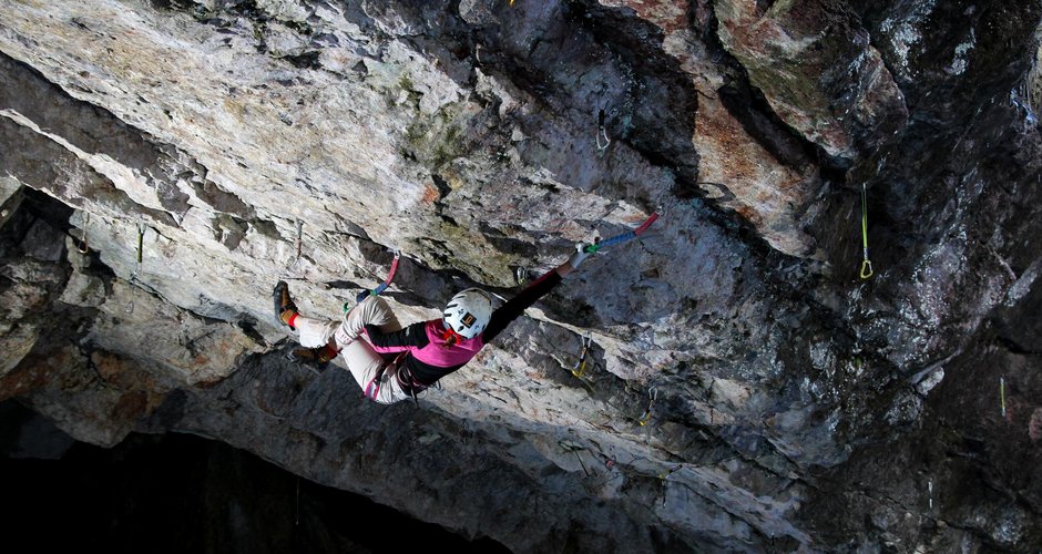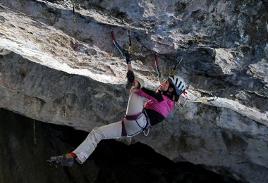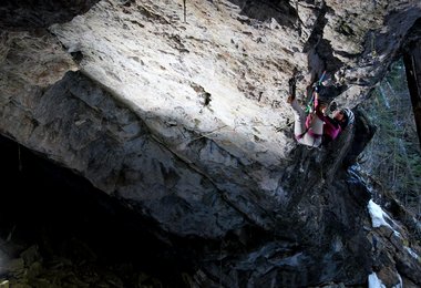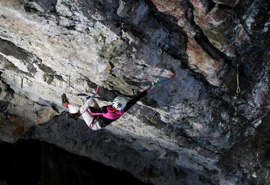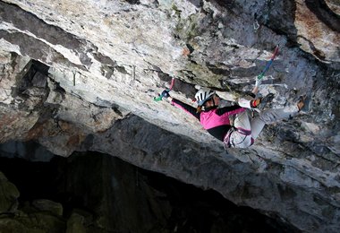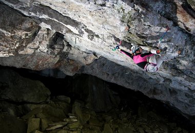 Mirek Matejec war schon letztes Jahr in der Grotte und hatte die "Pray" versucht und konnte so Lucie einige hilfreiche Tipps geben. Lucie war begeistert beim Anblick des großen Daches und mit Hilfe von Mirek fand sie sich auch schnell in der Route zurecht.