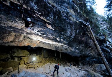 Wenig später gelingt auch Mirek der erfolgreiche Durchstieg der langen Dachroute und so fand der Besuch der Starzlachklamm für beide Athleten doch einen versöhnlichen Abschluss! Bei der Bewertung der "Pray" bessern sie aber etwas nach und erhöhen die Route auf M14 (irgendwo zwischen Ironman und Bafomet).