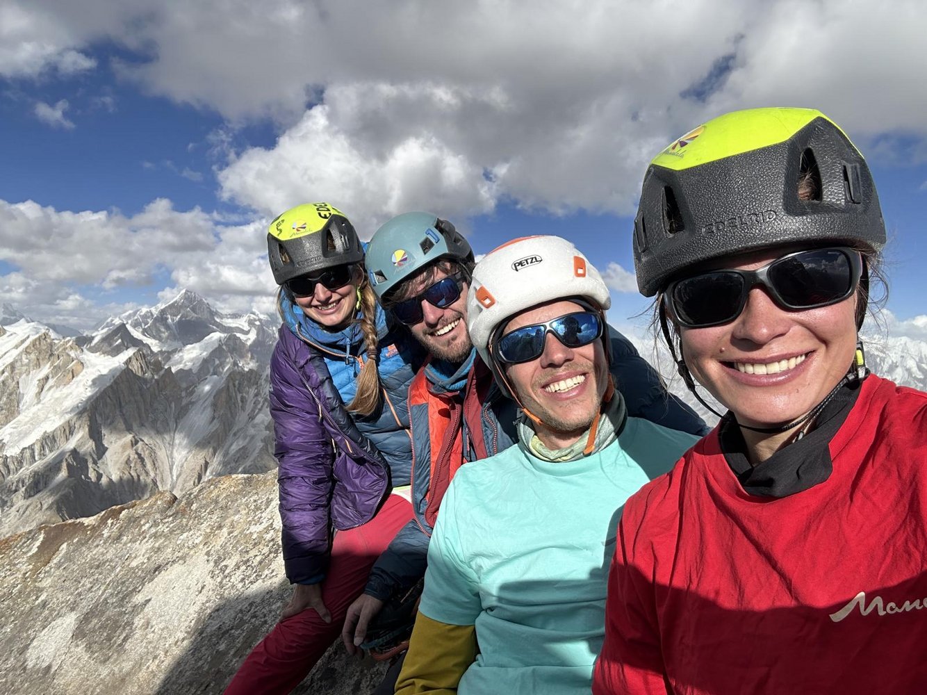 „Als Team – Rosa Windelband, Hanna Kallweit, Sebastian Gantz und Julius Brunner – ist es uns gelungen, die gesamte 650 Meter lange Route frei zu klettern, mit Schwierigkeiten bis 7c+ auf über 6000 Metern. Unser gemeinsames Ziel war, dass jede Seillänge von mindestens einer Person des Teams frei geklettert wird – wir freuen uns, genau das geschafft zu haben. Am 11. August 2025 um 16:00 standen wir auf dem Gipfel des Nameless Towers.“