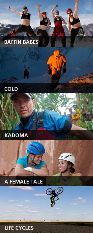 von Minus 40 Grad! - und sie überleben beim Abstieg sogar einen Lawinenabgang. Hendri Coetzee, Chris Korbulic und Ben Stookesbury wagen sich mit dem Kajak zum ersten Mal auf den Luguka River („Kadoma“) und eine Gruppe Franzosen setzt beim Highlining neue Akzente: „This Must Be The One“ zeigt ihren Balanceakt in luftiger Höhe, sowohl im Mont-Blanc-Massiv als auch zwischen Pariser Wolkenkratzern. Nach „Being There“ werdet Ihr nur noch in Norwegen Skifahren wollen, nach „The Art of Flight“ vom Fliegen träumen und dank „Life Cycle“ nie wieder unbedacht beim Radfahren in die Pedale treten. Ebenso wie der Ausnahme-Mountainbikefilm eröffnet auch „The Majestic Plastic Bag“, ein Kurzfilm über das Leben einer ganz gewöhnlichen Plastiktüte, völlig neue Perspektiven. In „A Female Tale“ wachsen die beiden jungen Boulderinnen Anna Stöhr und Juliane Wurm über sich hinaus, als sie unter Anleitung der amerikanischen Kletterlegende Lynn Hill zum ersten Mal das Rissklettern ausprobieren. Und zu guter Letzt verrät uns Kameramann Mickey Smith warum er eigentlich so gerne Surffilme dreht („Dark Side of the Lens“).