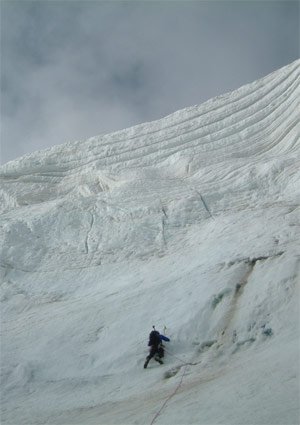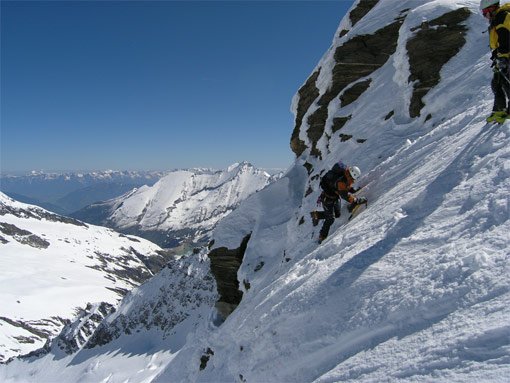 Ein rassiger und toller Anstieg der auch oft im Rahmen von Ausbildungskursen gemacht wird. Im unteren Drittel Firn, dann aber blankes Eis. Im Vergleich zu den Glocknerwänden noch relativ steinschlagsicher, da die Wand auf einem Streifen von 150m bis zum NW Grat reicht (keine Felsen beim Ausstieg aus denen sich Steine lösen können - einzig der Einstieg über den Gletscher heikel).