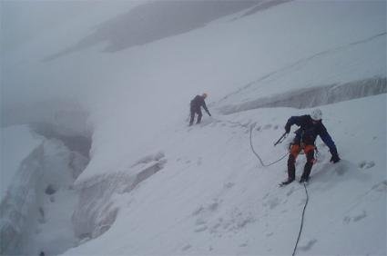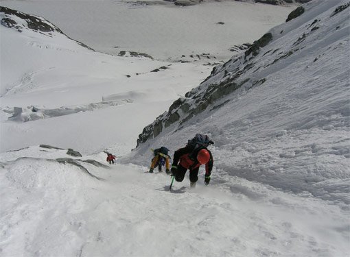 - Für alle Anstiege ist komplette Eisausrüstung erforderlich, wobei die neuen Steileisgeräte für das Sichern im Firn (Toter Mann od. eingerammter Pickel) nicht geeignet sind.