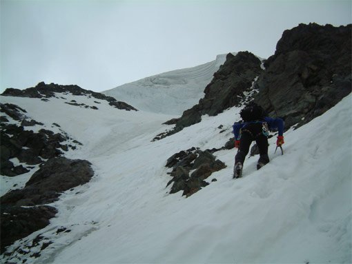 Firn- und Kombikletterei, Stellen bis 60° und II, 200 Hm, Zeit: 2 Stunden.