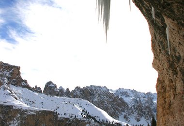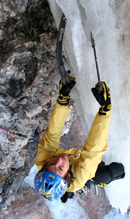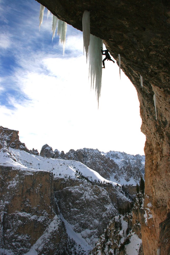 Illuminati ist einer der 160 Meter lange, sehr überhängende Eis- und Mixedroute im Grödner Langental. Die alpine Umgebung dort ist genial. Die oberen 3 Seillängen Eis (Mysteria genannt) wurden bereits 1998 von den Lokals Hannes Lemayer und Valentin Riegler geklettert. 2006 klettert der Top Eiskletterer Albert Leichtfried durchs gigantische Dach und steigt über den gesamten Eisfall aus. Sein Bewertungsvorschlag: M11+/WI6+, 160 Meter. Wahrscheinlich der schwierigste Mixed Longclimb der Welt! Die Bilder die ich davon sah verblüfften mich total. Leider war 2007 ein viel zu warmer Winter und ich kam nicht dazu, sie zu probieren. Auch sonst glaube ich hat sie noch niemand wiederholt. Das wollte ich heuer ändern.