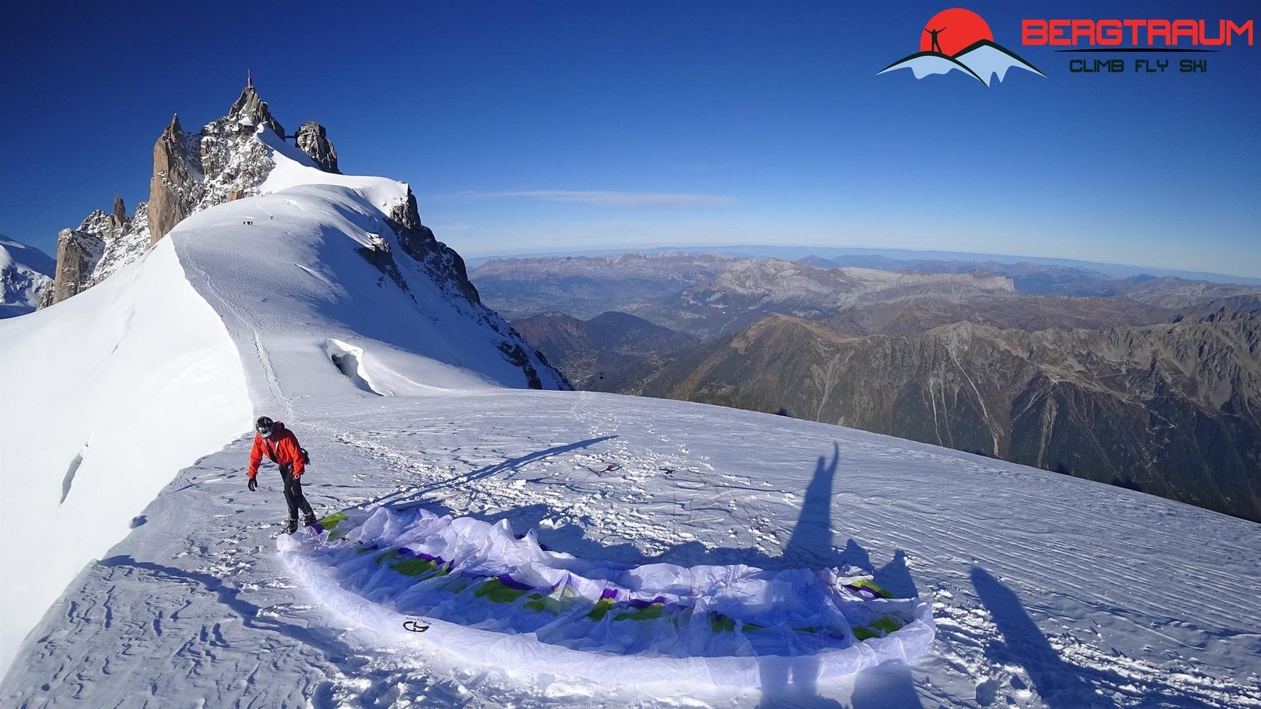 Der ganz leichte Westwind am Startplatz der Aiguille du Midi auf 3.600 m Höhe ließ mich etwas nachdenklich werden: Nord- oder Südwind wären optimal dort oben- Westwind bedeutet verringerten Auftrieb und längeres Anlaufen. So war es dann auch. Unter Ameisenkniehöhe fegten wir über die letzte Spalte nach dem Start über den Schnee und schaffte den Sprung über den Felsgrat nach Süden ins mer de glace. Dani entfuhr ein Jubelschrei- war es doch ein wenig knapper als gedacht!