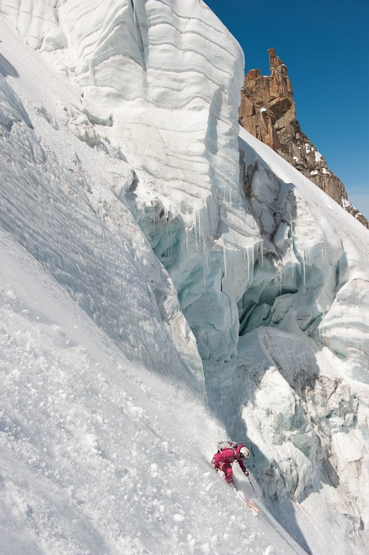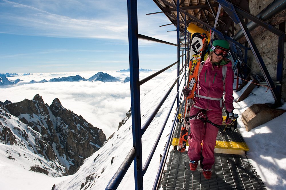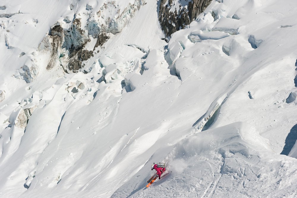 „God is a Freeskier“ behauptet das T-Shirt eines guten Freundes. Heute ist einer dieser Tage, an dem ich denke: ganz genau! Weißgold strahlt die Sonne vom tiefblauen Himmel. Granitgipfel und schillernde Gletscher heben sich kontrastreich ab. Willkommen in den Westalpen. Langsam ruckelt sich die Gondel nach oben. Von La Palud über das Refugio Torino bringt sie uns zur Bergstation am Pointe Helbronner (3.462m). Gerne gestatten wir uns diese Aufstiegshilfe, denn Glen hat uns einen echten Brocken serviert: die Traverse „Glacier de la Noire“. Hinauf, hinab, hinauf, hinab. Viele Meter zu Fuß, Gegenanstiege, Steileis- und Harsch-Aufschwünge warten auf uns, doch dann kommt die Belohnung: ein – hoffentlich unberührtes - Couloir, bis zu 50° steil und laut Glen einer der lohnenswertesten Runs im gesamten Mont-Blanc-Gebiet.