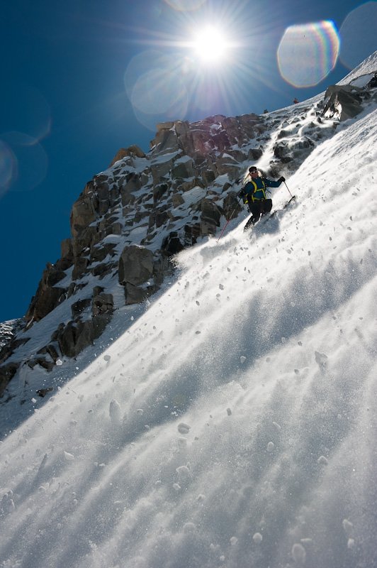 Knapp drei Stunden später. Wir stehen am „Drop in“, der Einfahrt in ein atemberaubendes Couloir. Glen hat nicht zuviel versprochen. Links und rechts ziehen messerscharfe Granitgrade nach oben. Doch vor uns eröffnet sich ein kleines Paradies. Ein Paradies, das wir uns mit unserer eigenen Kraft und Ausdauer, unserem eigenen Können erschließen. Der Firn ist perfekt, doch wir müssen uns beeilen. Mit jeder Minute wird es wärmer, die Gefahr vor allem durch Steinschlag steigt.