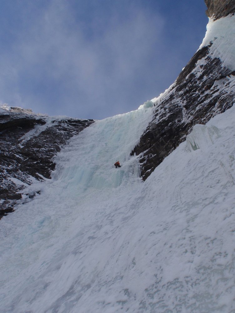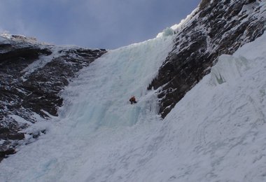 Allein der Name flößt Respekt ein. Der Wasserfall hat ca. 250 m steiles, zum Großteil senkrechtes Eis und weist eine Schwierigkeit von WI 5/5+ auf. Nach dem steilen Mittelteil kommt noch eine ca. 50m lange Ausstiegspassage bis man wirklich oben steht und entspannt den Ausblick genießen kann.