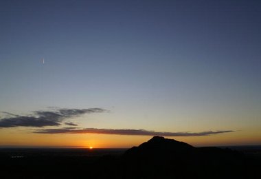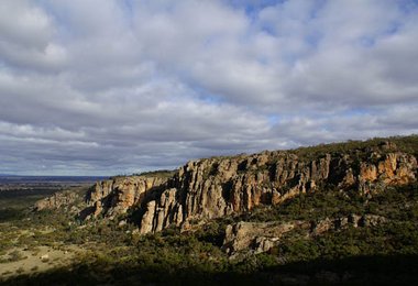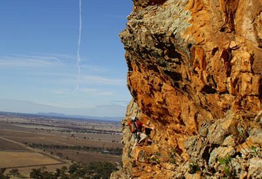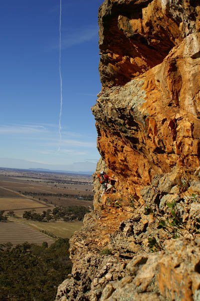 Nördlich der Grampians ragt der 200 Meter hohe Mt. Arapiles aus der brettlebenen Landschaft. Schon von weitem sieht man das etwa 2 km breite Felsband auf seiner Südseite, welches wieder einmal Sandsteinkletterei vom Allerfeinsten bietet.