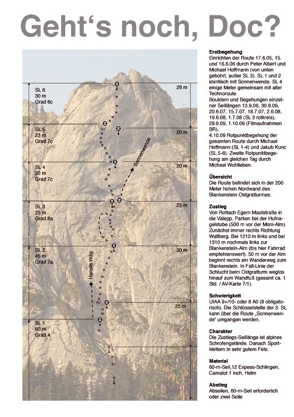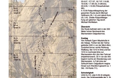 Die Route zeichnet sich durch perfekten, sehr kompakten Kalk aus. Die Kletterei ist sehr technisch und der Kalk der Nordwand des Blankenstein bietet nur sehr wenig Reibung, deswegen brauchte es auch ein wenig "einklettern" bis Michi die Route klettern konnte, insgesamt war er 2x vor dem Durchstieg in der Route.
