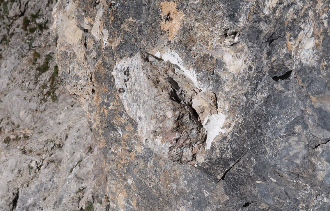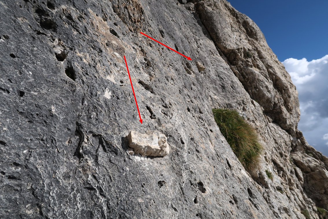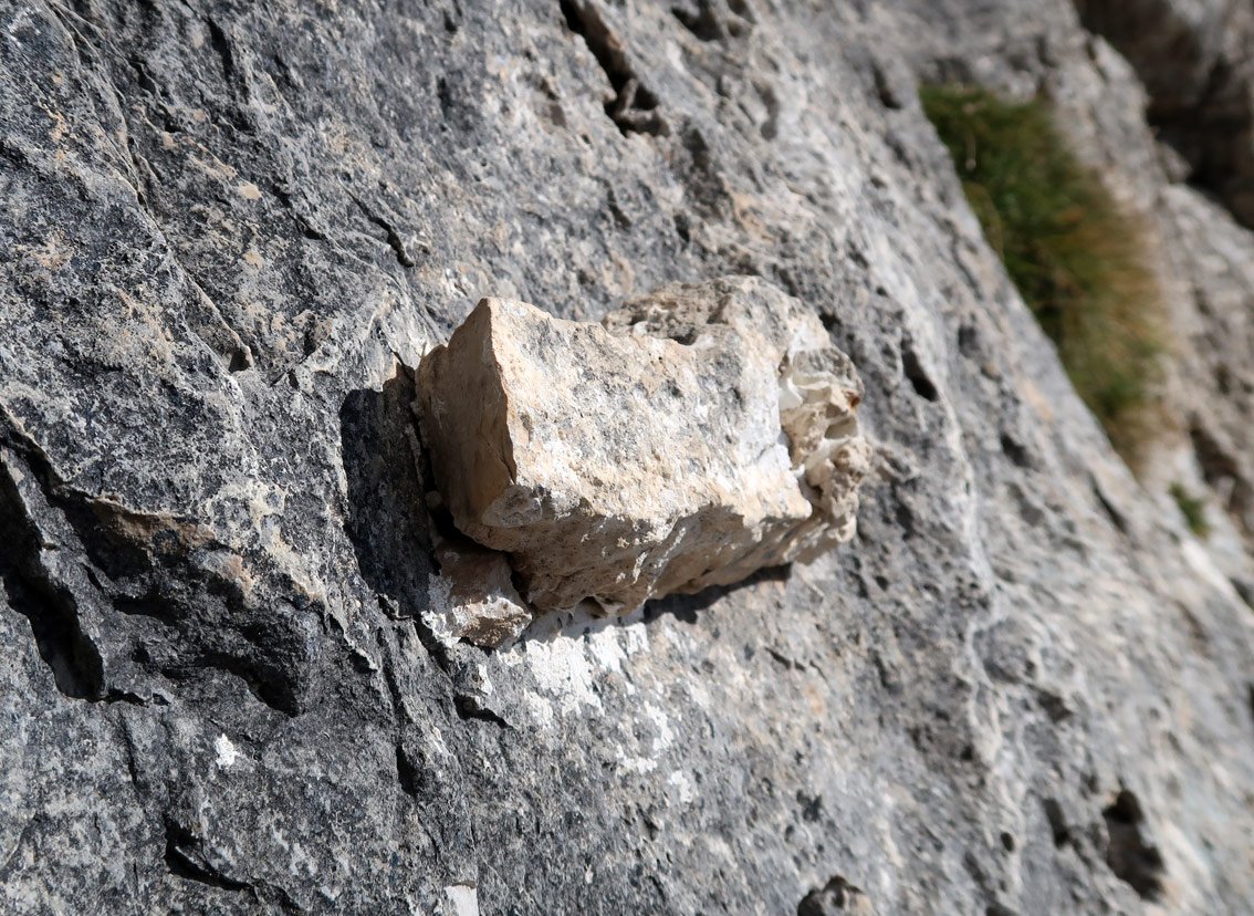 Nach der ersten Seillänge kamen wir zu einem Bohrhakenstand, an dem im Grunde nichts auszusetzen war - solide Standplätze sind aus unserer Sicht bei Sanierungen o.k. Es folgte dann ein Bohrhaken als Zwischenhaken – das war auch noch im Rahmen. Unterhalb der Schlüsselseillänge, der sogenannten „Schwarzen Platte“ blieb mein Blick aber an einem weißen Stein in der Schwarzen Platte hängen. Schon komisch, dass der Stein genau dort liegen bleibt, wenn er von oben runter fällt… (das war unser erster Gedanke).