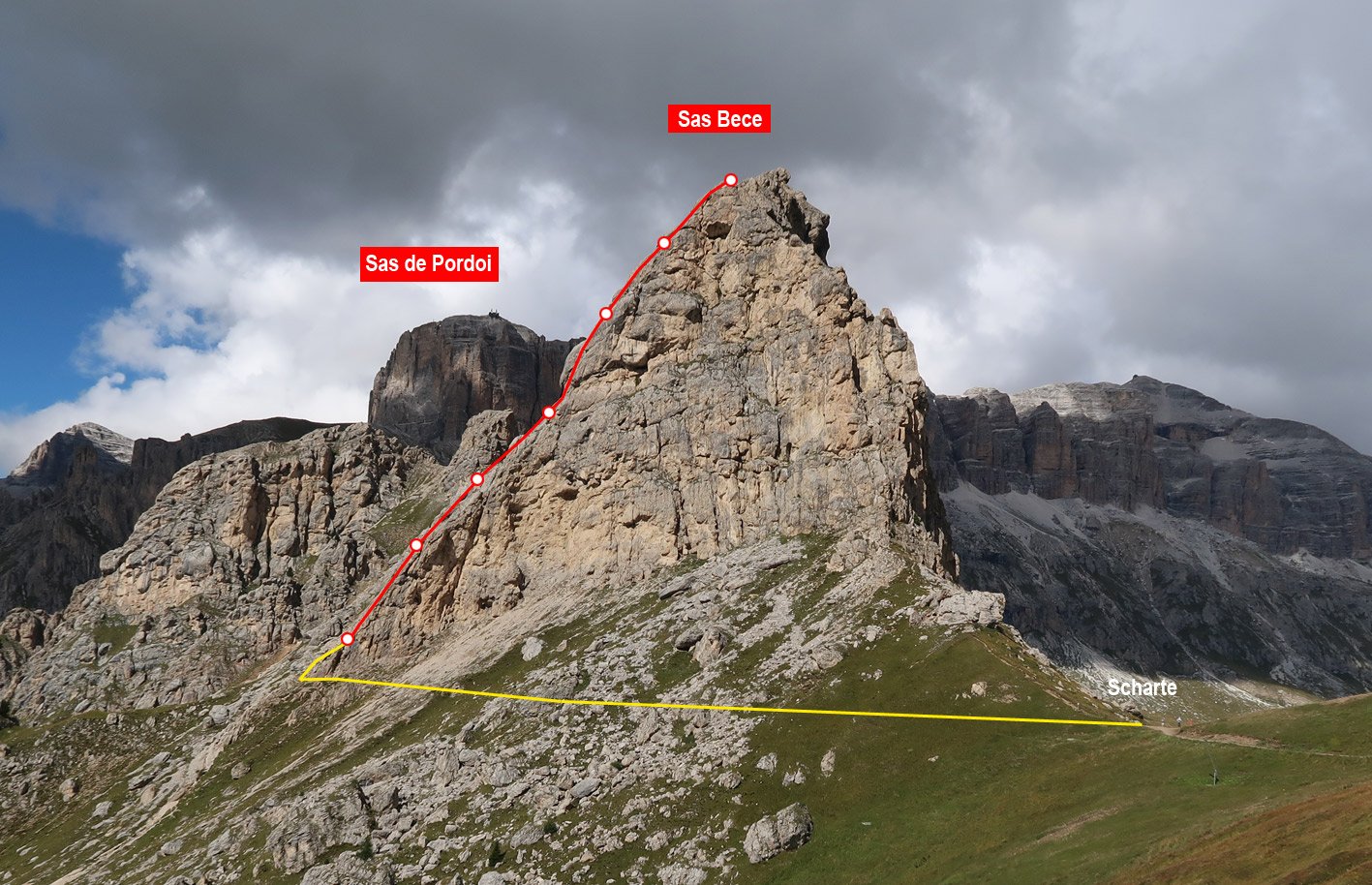 Wir waren in den Dolomiten unterwegs und suchten für den Nachmittag noch eine leichte Route mit kurzem Zustieg. Unsere Wahl fiel auf den Sas Bece Westgrat beim Pordoi Pass, eine 6 Seillängen-Tour im 3ten und 4ten Grad, mit einer Schlüsselseillänge im 4ten. Wir hatten ein Topo von Mauro Bernadi mit, auf dem Normalhaken, Köpferl(schlingen) etc. eingezeichnet waren.